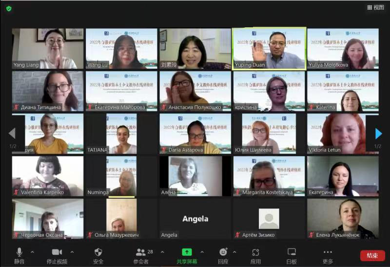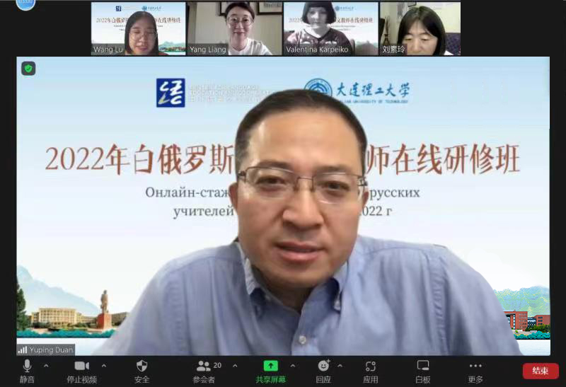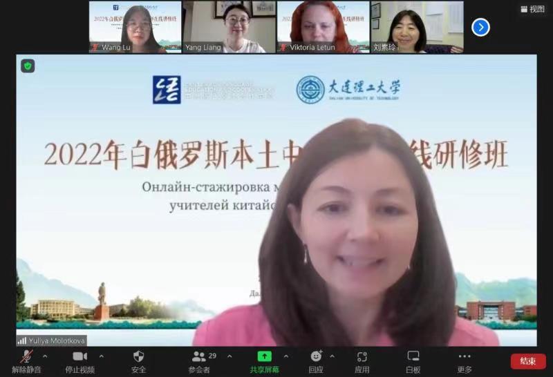 7月29日,由教育部中外语言交流合作中心主办,大连理工大学承办的“2022年白俄罗斯本土中文教师在线研修班(第二期)”举行线上结业仪式。我校国际教育学院院长段玉平、白俄罗斯国立大学共和国汉学孔子学院中方院长刘素玲、汉语教研室主任尤莉亚·马拉特科娃出席结业仪式。仪式由国际教育学院孔子学院管理办公室副主任杨亮主持,25位白俄罗斯本土中文教师在线参加仪式。