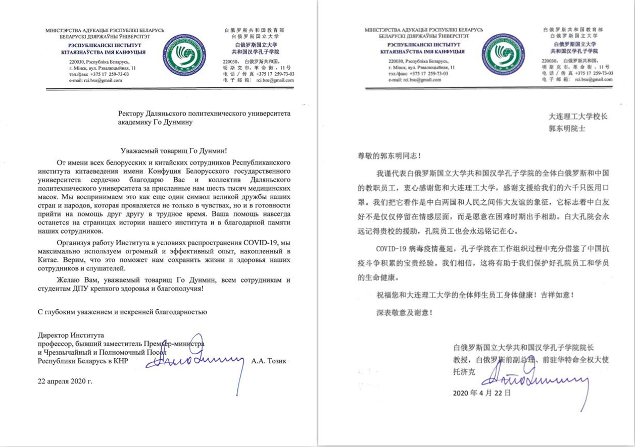 在海外抗击新冠肺炎疫情日益严峻之时,我校作为白俄罗斯国立大学共和国汉学孔子学院(下文简称“白大孔院”)和白俄罗斯国立大学大连理工大学联合学院(下文简称“白中学院”)的中方合作院校,第一时间表达诚挚慰问,并紧急筹集一批口罩寄送至白俄罗斯。