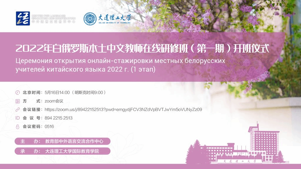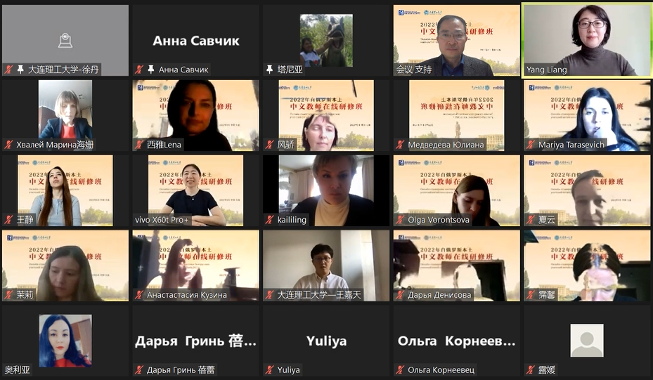 5月16日,由教育部中外语言合作交流中心主办,大连理工大学承办的“2022年白俄罗斯本土中文教师在线研修班(第一期)”正式开班。我校国际教育学院院长段玉平、白俄罗斯国立大学共和国汉学孔子学院中方院长刘素玲出席了开班仪式。仪式由国际教育学院孔子学院管理办公室副主任杨亮主持。23位白俄罗斯本土中文教师和授课教师代表在线参加了仪式。