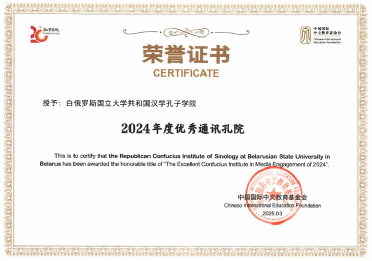 2024年,时值孔子学院品牌创立20周年,全球近500所孔子学院(课堂)积极向孔子学院微信公众号、抖音视频号等媒体平台投稿,讲述孔院精彩故事、树立孔院良好形象,共庆孔院20岁生日,为提升孔子学院品牌影响力做出积极贡献。中国国际中文教育基金会综合各孔院的投稿量、录用情况、文稿和视频原创性等因素,授予全球61所孔子学院“2024年度优秀通讯孔院”称号。我校白俄罗斯国立大学共和国汉学孔子学院获评“优秀通讯孔院”称号。