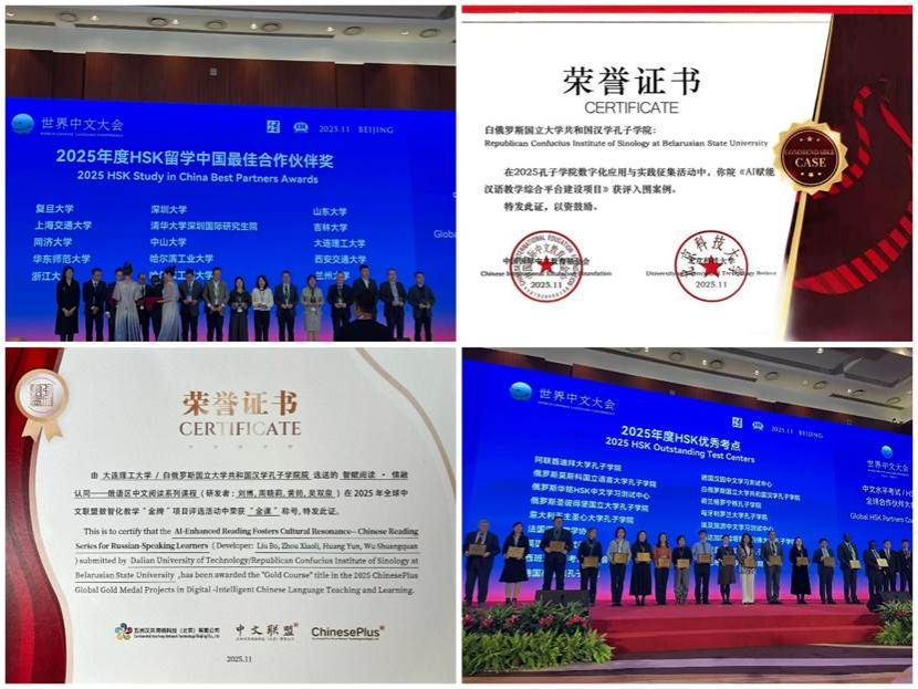 我校获评汉考国际“2025年度HSK留学中国最佳合作伙伴”,并成为HSK留学中国平台首批入驻高校;白俄罗斯国立大学共和国汉学孔子学院荣获“2025年度HSK优秀考点”;孔子学院教师团队在基金会与北京科技大学联合举办的“2025年孔子学院数字化应用与实践征集活动”中荣获优秀案例,在中文联盟“2025年全球中文联盟数智化教学‘金牌’项目评选活动”中荣获“金课”称号。多项荣誉的取得,充分体现了我校在国际中文教育领域的积极作为与广泛影响。学校将以此为契机,持续发挥特色优势,为推动中文教育高质量发展、服务国家教育对外开放大局注入新动能。