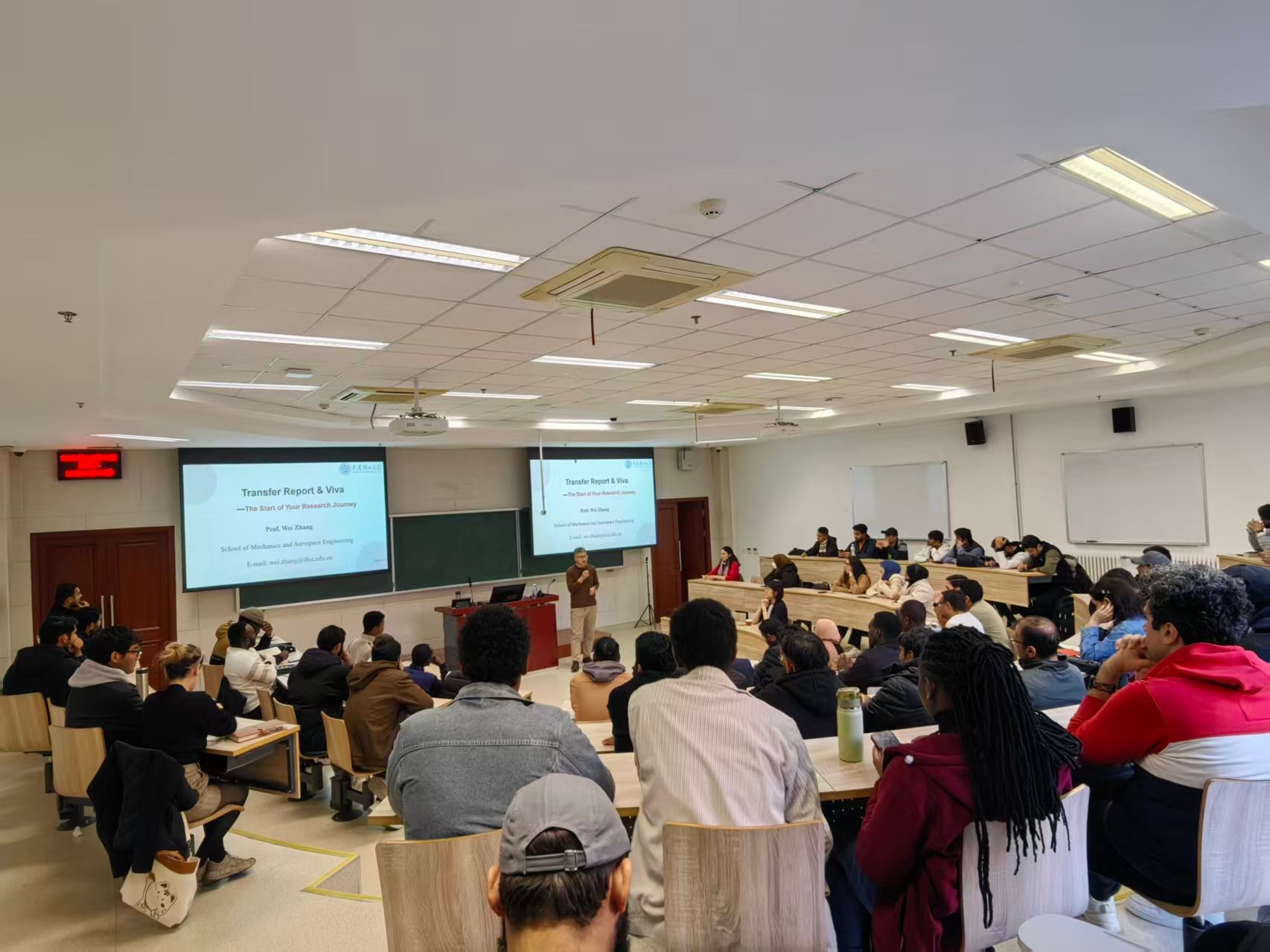 To help international postgraduates clarify the entry path of scientific research and consolidate their academic foundation, the School of International Education (SIE) of Dalian University of Technology successfully held the first "Duxue" Academic Navigation Forum on the afternoon of October 28, 2025. Focusing on the writing of thesis proposals and the development of academic abilities for international postgraduates, the event specially invited Professor Zhang Wei from the School of Mechanics and Aerospace Engineering as the keynote speaker. Prof. Zhang brought an academic lecture with both theoretical height and practical guiding significance to international postgraduates from different majors, helping them smoothly embark on the road of scientific research. The event was hosted by Du Xueling from the Teaching and Academic Affairs Office of SIE, with the participation of Guo Hanning, Assistant Dean of SIE, and nearly 70 international postgraduates.