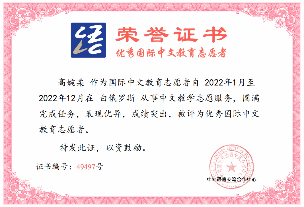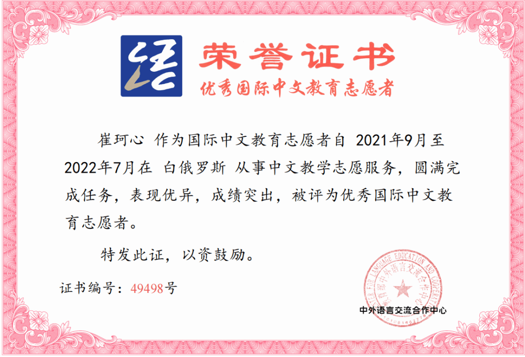 Gao Wanrou, Cui Kexin and Hou Tianjiao were awarded the title of “Excellent International Chinese Education Volunteers” in the 2022 Global Outstanding Volunteer Selection for International Chinese Education which is held by the Sino-foreign Language Exchange and Cooperation Center of the Ministry of Education.